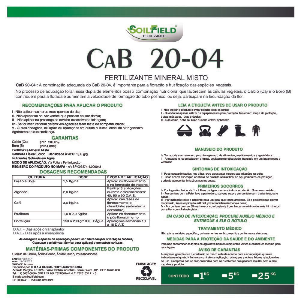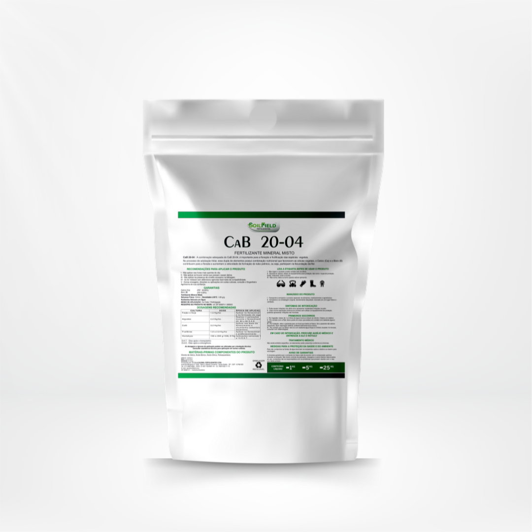 CaB 20-04 é um fertilizante mineral misto altamente concentrado em Cálcio (20%) e Boro (4%), desenvolvido para maximizar a floração, frutificação e fertilização das plantas. Sua fórmula balanceada age diretamente no desenvolvimento reprodutivo dos cultivos, garantindo: